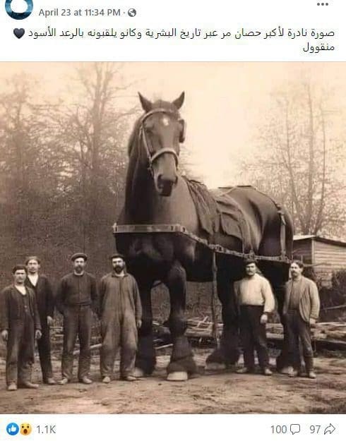 تداول ناشطون على فيسبوك صورة يدعون أنها صورة حقيقية تظهر أكبر حصان في التاريخ،