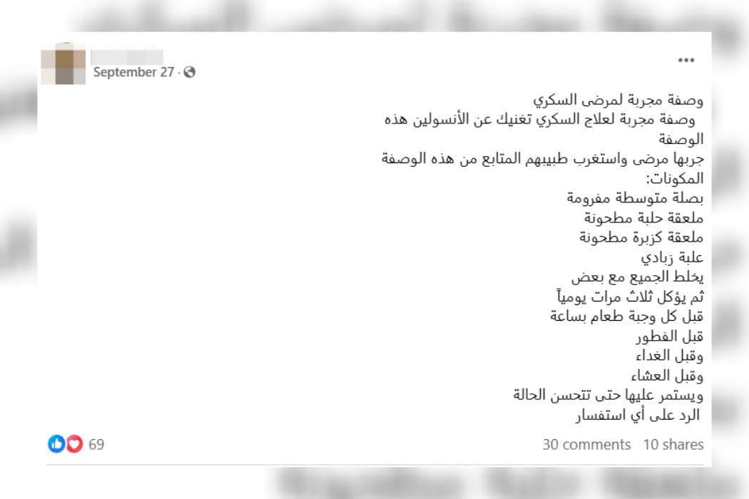 لا يمكن لهذه الوصفة أن تعالج السكري أو تغني المريض عن استخدام الإنسولين والأدوية الموصوفة للسكري