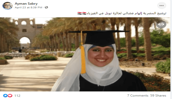 تداول رواد مواقع التواصل الاجتماعي ادّعاء يزعم ترشيح الباحثة المصرية الهام فضالي لجائزة نوبل في الفيزياء،