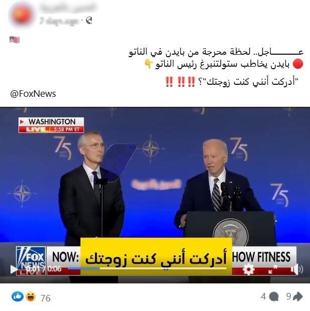 من خلال البحث بالكلمات الدلالية: “Fox News: Biden Speaks to NATO” تبين أن لقطات الادعاء اقتبست من فيديو نشرته قناة فوكس نيوز في 09 يوليو 2024،
