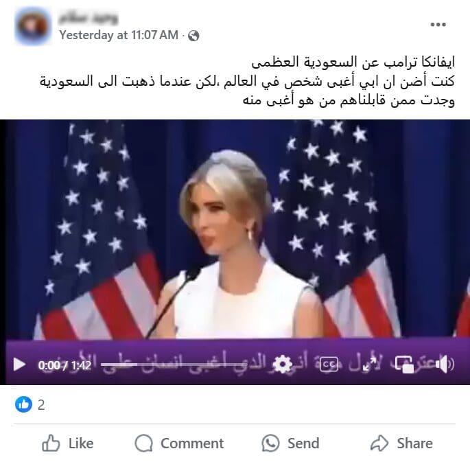 في هذا السياق تداول ناشطون على الفيسبوك مقطعًا يدعون أنه يصور إيفانكا ترامب تهين المملكة العربية السعودية،