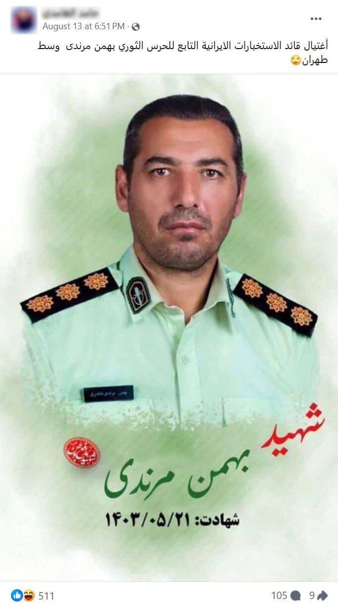 الشخص الظاهر في الصورة هو ضابط شرطة يدعى “بهمن مرندي” قضى في إيران مؤخرًا، وليس رئيس استخبارات الحرس الثوري الإيراني