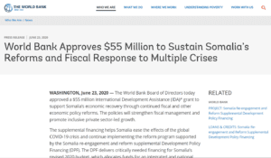 ودعمًا للإصلاحات وافق البنك الدولي في مايو الماضي على منح الصومال 55 مليون دولار، لدعم الانتعاش الاقتصادي من خلال إصلاحات مستمرة في المالية العامة والسياسات الاقتصادية الأخرى وتعزيز سياسات الإدارة المالية وتشجيع النمو الشامل بقيادة القطاع الخاص.