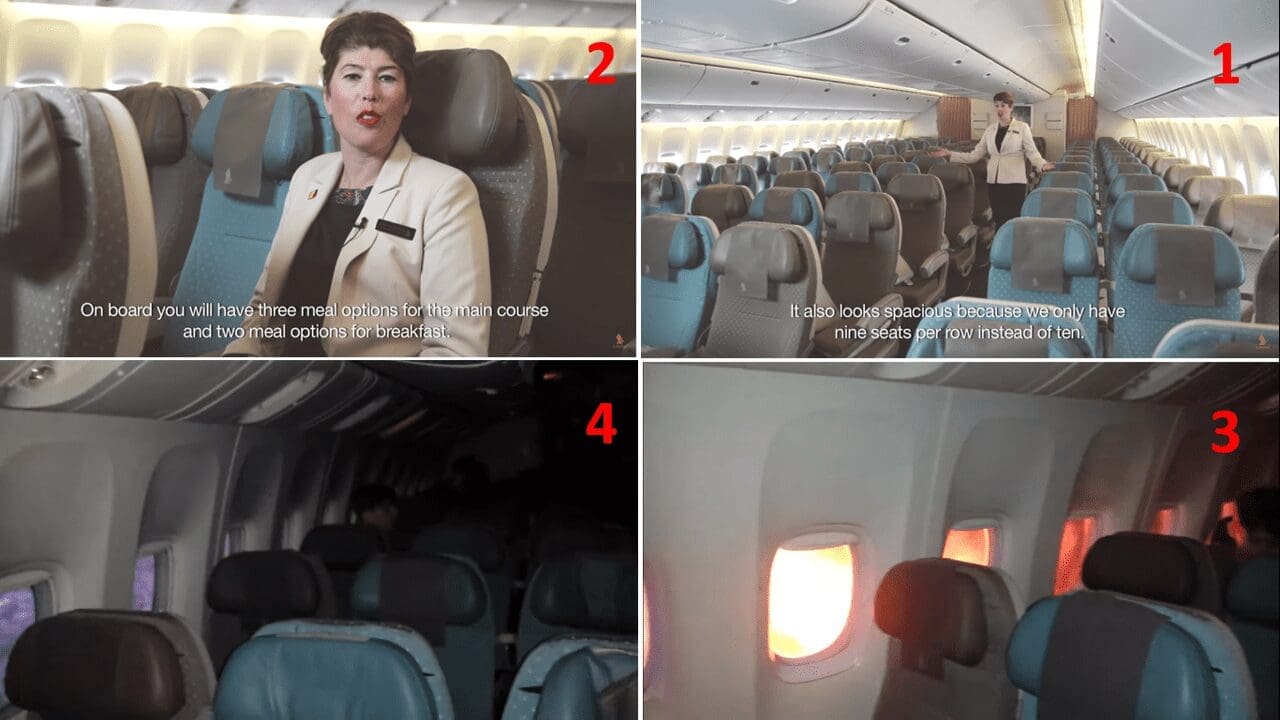 لقطات مركبة تظهر مطابقة الطائرة الظاهرة في مقطع الادعاء (3و4) مع مشاهد من داخل الطائرة Boeing 777-300ER (لقطة 1و2)