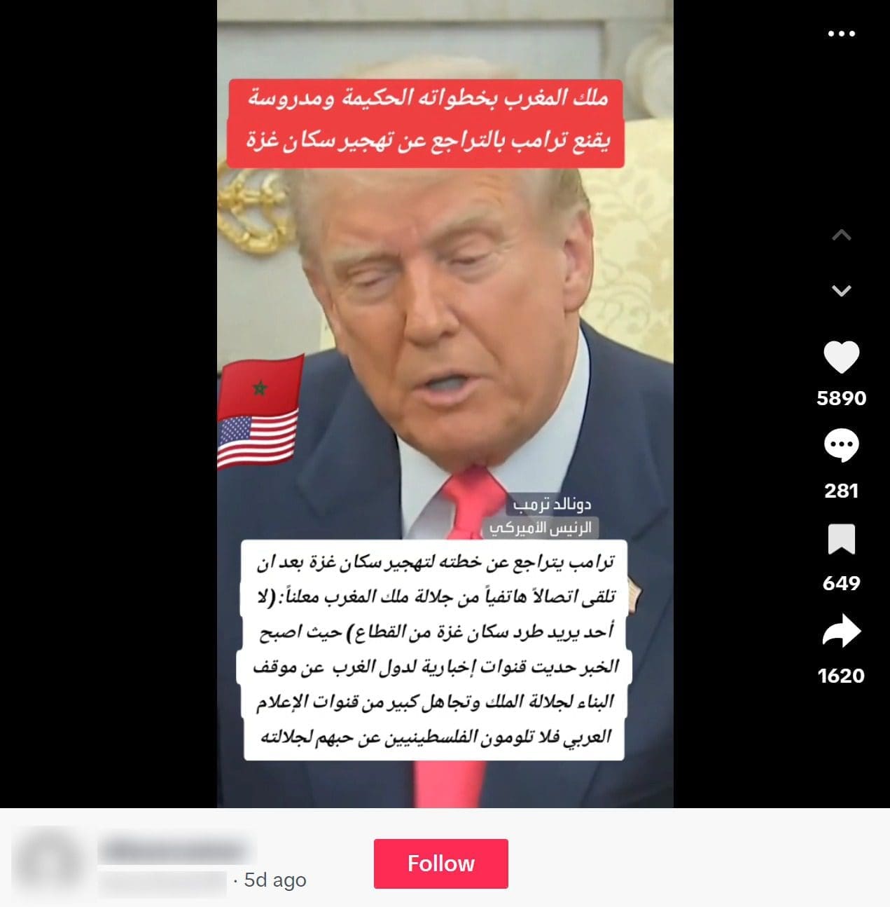 الوصف المرفق بهذا المقطع مضلل، ولم يصرح الرئيس الأمريكي دونالد ترامب بتراجعه عن قرار تهجير الفلسطينيين من قطاع غزة بسبب ضغط ملك المغرب عليه