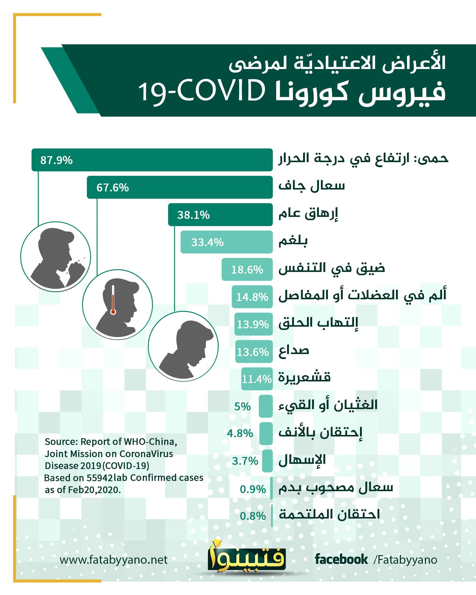 تشمل أعراض الإصابة بمرض فيروس كورونا أعراض الإصابة بأي فيروس آخر للجهاز التنفسي مثل الإنفلونزا وغيرها