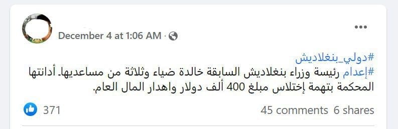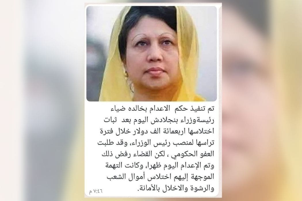 تناقل ناشطون على فيسبوك خبرًا يدعي  أنّه تم إعدام رئيسة وزراء بنغلاديش السابقة خالدة ضياء، بتهمة الاختلاس،