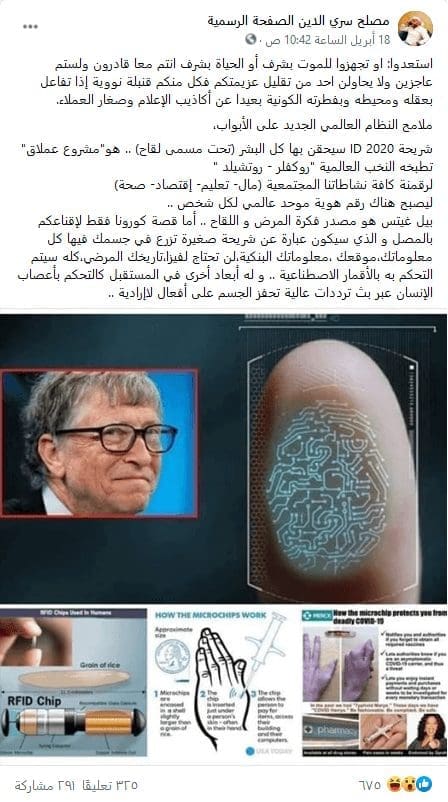 انتشار فكرة أن فيروس كورونا هو اختراع من قبل بيل غيتس لكي يبرّر زرع شريحة للتحكم بالبشر من خلال لقاح للوباء، ليس فقط في العالم العربي بل في العالم أجمع
