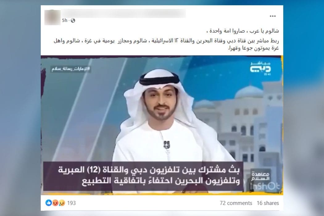 ومنذ أن قامت الإمارات العربية المتحدة بتطبيع العلاقات مع إسرائيل عام 2020 تتلقى انتقادات واسعة على مواقع التواصل، في هذا السياق تناقل مستخدمون على منصات التواصل مقطعاً يدعون أنه لبث مشترك بين تلفزيون دبي وتلفزيون البحرين وقناة 12 العبرية احتفالاً باتفاقية التطبيع بينهم،