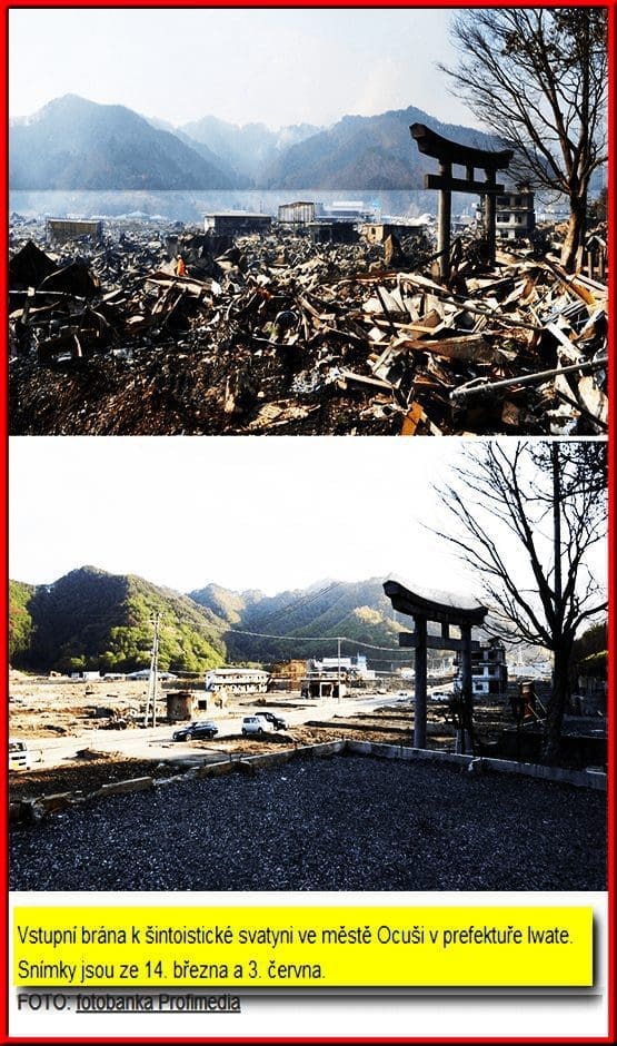 والبوابة التي بالصورة الحديثة فهي لبوابة مدخل ضريح شنتو في أوكوشي ، محافظة إيواتي بعد تسونامي 2011 ولم تدمر المباني كلها حيث أن 278 ألف تم تدميرها بالكامل وأن 726 ألف تم تدميرها جزئيًا