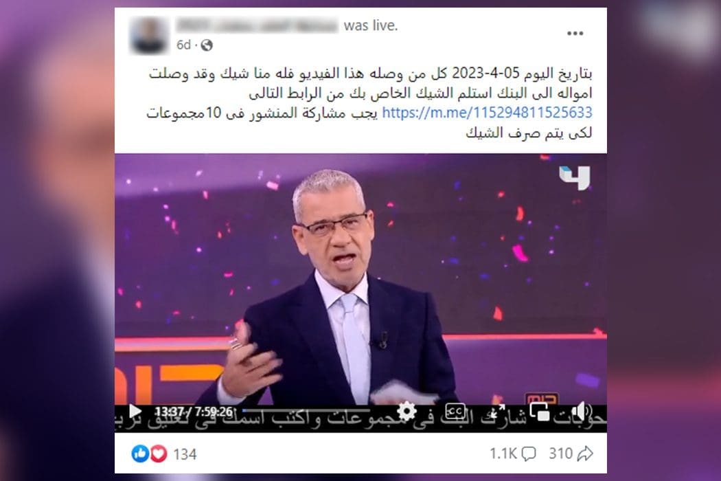 تناقل بعض الناشطين على منصة الفيسبوك مسابقة تدّعي وجود جائزة (شيك) تحصل عليها بعد مشاركة مقطع فيديو في مجموعات الفيسبوك.
