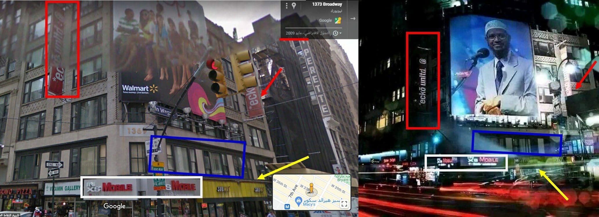 مما يؤكد أن الصورة معدلة رقميًا، ولا تظهر صور ذاكر نايك على شاشات عرضٍ ضخمة في قطر.