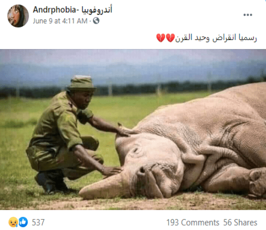 انتشرت على مواقع التواصل الاجتماعي فيسبوك وتويتر صورة وحيد القرن بجانب رجل يزعم ناشروها أنها تظهر موت آخر حيوان وحيد القرن الأبيض الشمالي في العالم،
