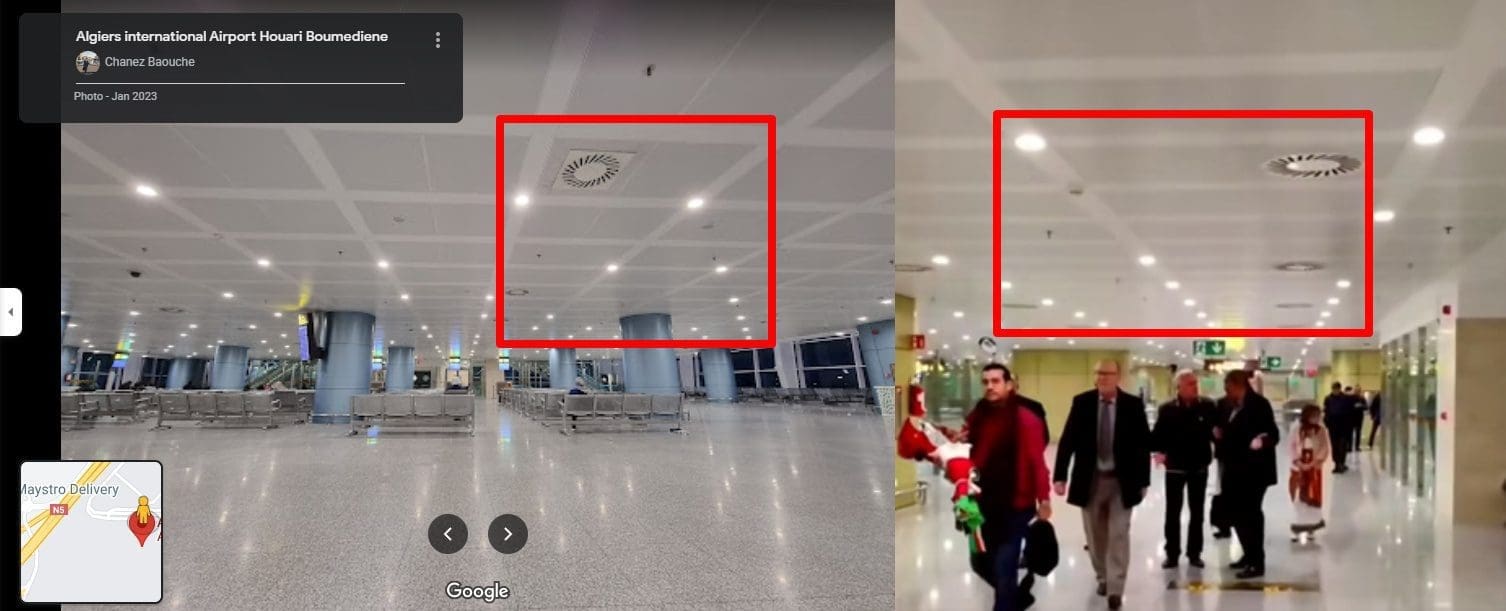 المشاهد في مقطع الادعاء، مع الصور التي توفرها خرائط جوجل لمطار هواري بومدين بالجزائر العاصمة.