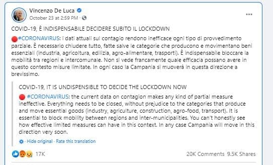 استنادًا إلى نتائج البحث التي ظهرت لنا، تبيّن أنّ الحاكم الإقليمي فينسينزو دي لوكا قد دعا في 23/10/2020 عبر حسابه في فيسبوك إلى حظر التجول والإغلاق التام مدة 40 يومًا بعد ارتفاع إصابات كورونا وتسجيل 2280 إصابة جديدة في يوم واحد في منطقة كامبانيا،
