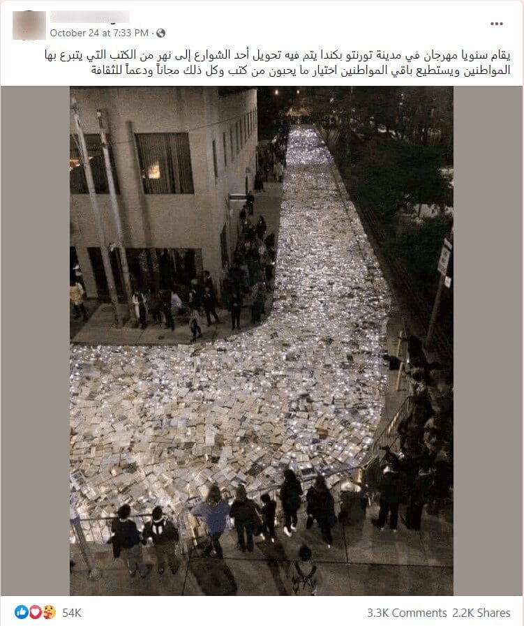 تناقل ناشطون على منصات التواصل الاجتماعي صورة يزعم ناشروها أنها لمهرجان سنوي للكتب، يقام في تورنتو- كندا،