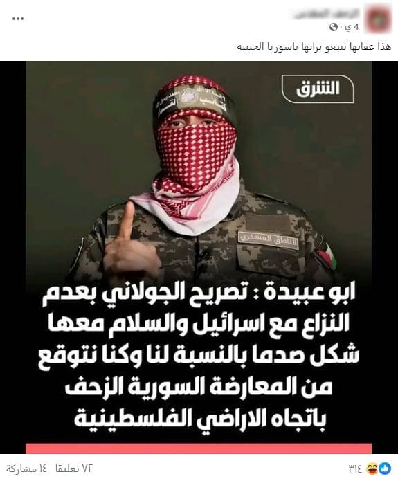 بحسب فرانس 24 –دون تصرف-: «قال أحمد الشرع بشأن الغارات التي تشنها إسرائيل منذ سقوط نظام الأسد، “كان لإسرائيل سبب أو ذريعة تتمثل في الميليشيات الإيرانية لضرب سوريا والآن لم تعد هذه الميليشيات موجودة”، وأضاف: “لا نريد صراعا مع إسرائيل أو مع دول أخرى ولن تُستخدم سوريا لاستهداف دول أخرى، لقد تعب السوريون ولا يريدون سوى العيش بسلام”»، في هذا السياق تداول ناشطون على فيسبوك تصميما منسوبا لقناة الشرق يتضمن تعليقا من أبي عبيدة على هذه التصريحات،