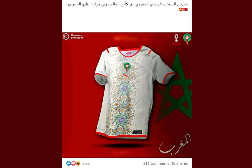 تداول ناشطون على موقع الفيسبوك صورة يزعم ناشروها أنّها تظهر تصميمًا لقميص المنتخب الوطني المغربي في كأس العالم مزين بالزليج.