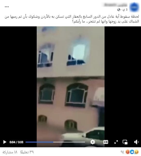 هذا المقطع متداول منذ عام 2024 ويعود لليمن، ولا يظهر سقوط آية عادل من نافذة منزلها مؤخرًا