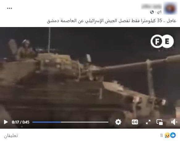 بحسب فرانس 24 –دون تصرف-: «بينما نفذ نحو 480 غارة جوية في سوريا خلال 48 ساعة منذ سقوط نظام الرئيس بشار الأسد، واصل الجيش الإسرائيلي توغله بشكل أعمق في الجزء السوري من هضبة الجولان الثلاثاء»، إثر ذلك تداول ناشطون على الفيسبوك مقطع فيديو يدعون أنه يظهر تقدم قوات الجيش الإسرائيلي على مسافة 35 كم من دمشق