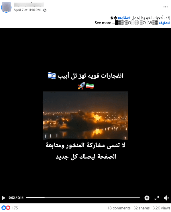 في هذا السياق تداول ناشطون على منصات التواصل الاجتماعي مقطع فيديو يدعون أنه من قصف إيراني على تل أبيب. إلا أن التحري الذي أجراه فريق منصة «فتبينوا» كشف أن هذا الادعاء غير صحيح.