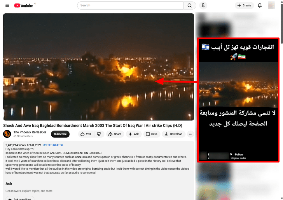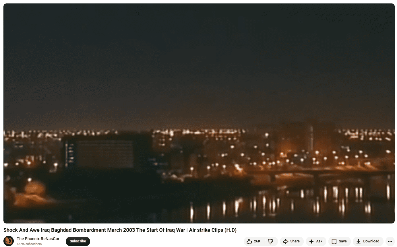 وباستكمال عملية البحث باستخدام الصورة التي عثرنا عليها، توصل فريق منصة فتبينوا إلى قناة The Phoenix ReNasCor على اليوتيوب، والتي نشرت مشهد الادعاء ذاته برفقة مشاهد أخرى للقصف الأمريكي على بغداد عام 2003.