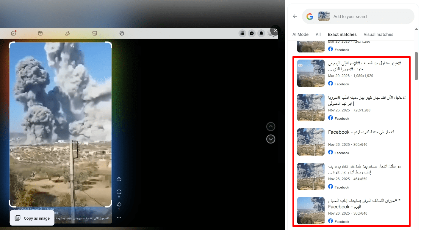 أرشد البحث العكسي باستخدام صورة ثابتة من مقطع الادعاء، إلى العديد من الحسابات على موقع فيسبوك التي نشرت المقطع ذاته هنا، هنا، وهنا في شهر نوفمبر/تشرين الثاني 2025، على أنه يوثق انفجارًا في بلدة كفر تخاريم بمدينة إدلب في سوريا آنذاك.