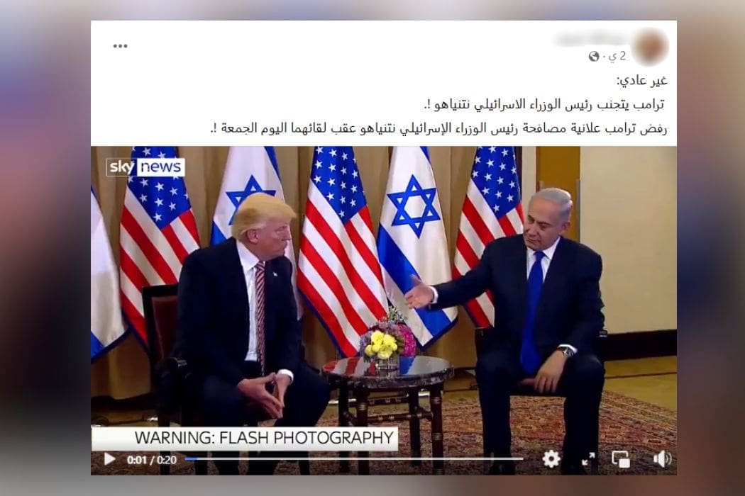 من خلال البحث العكسي عن إحدى لقطات المقطع الثابتة في محرك جوجل، تبين أن الفيديو يعود للقاء جمع ترامب مع رئيس الوزراء الإسرائيلي نتنياهو في 22 مايو 2017 في القدس، خلال جولة أجراها – الرئيس الأمريكي ذلك الوقت – دونالد ترامب في الشرق الأوسط آنذاك،