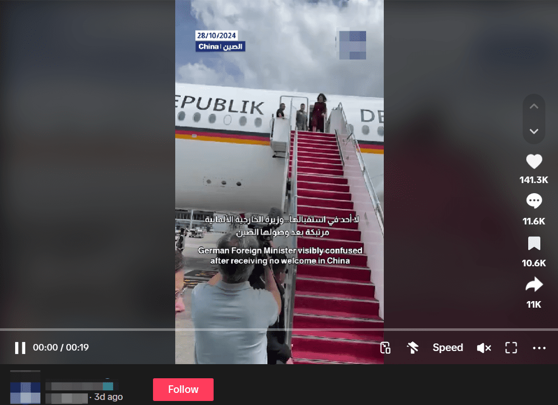 هذا المقطع ليس لوصول وزيرة الخارجية الألمانية للصين دون استقبال رسمي، ونفت وزارة الخارجية الألمانية صحة هذا الادعاء
