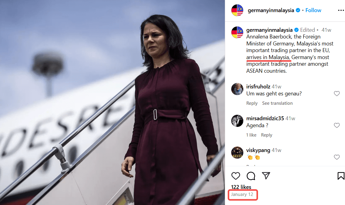 وأرجع حساب السفارة حقوق المشهد الذي شاركه إلى وكالة DPA- Picture Alliance، التي نشرت المقطع في 12 يناير 2024، على أنه يظهر وصول أنالينا بيربوك، وزيرة الخارجية الألمانية لمطار كوالالمبور في ماليزيا.