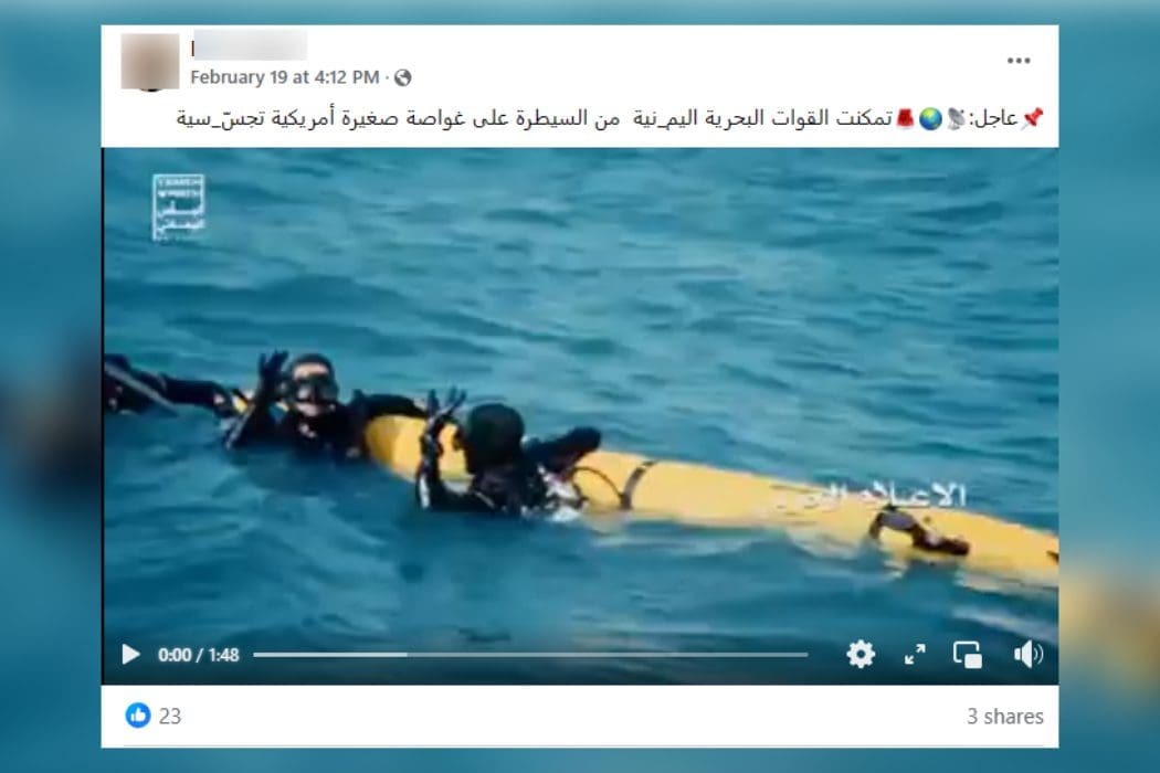 فيما لم يتسن لفريق فتبينوا التأكد من سياق المقطع الأصلي، إلا أن تداوله منذ 2018، ينفي أن يكون حديثاً و يظهر سيطرة الحوثيين على غواصة أمريكية مسيّرة في اليمن مؤخراً.