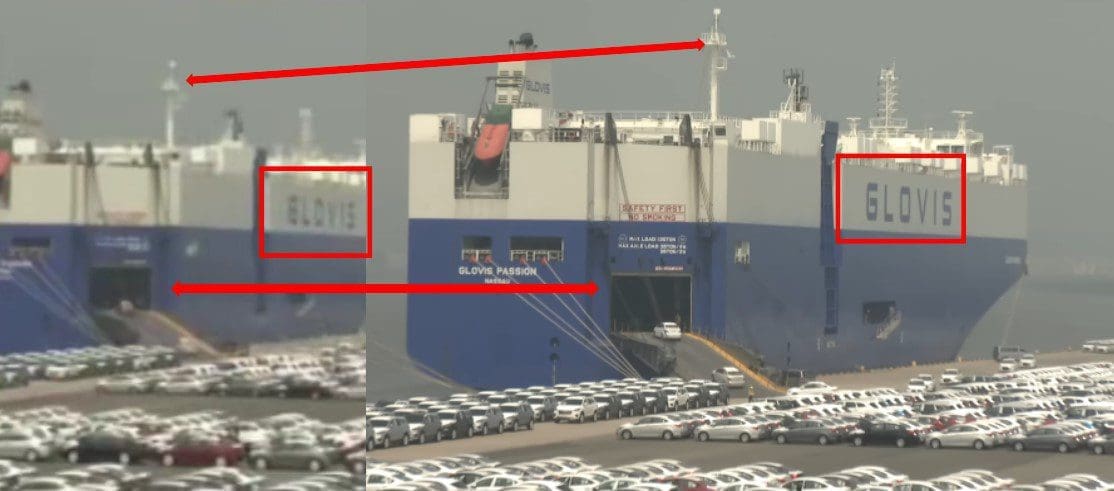 مبيناً أنه لرصيف شحنٍ هائل لشركة السيارات “هيونداي”، فيما تظهر لقطات مقطع الادعاء بدءاً من الثانية 00:08.