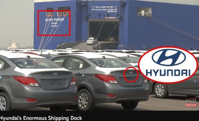 لقطة من مقطع يوتيوب لرصيف شحن هيونداي، ويظهر في اللقطة سيارات هيونداي بجانب سفينة نقل السيارات الظاهرة في المقطع