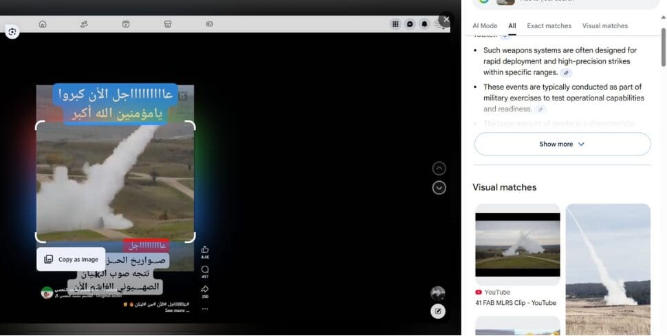 حيث يمكن مطابقة مشهد الادعاء عند الثانية 00:01 مع الثانية 00:57 من مقطع اليوتيوب. وأُرفق الفيديو في الوصف بالنص التالي -دون تصرف-: “جنود أمريكيون معينون في لواء مدفعية الميدان 41 يطلقون نظام راجمات الصواريخ المتعددة M270 خلال تدريب بالذخيرة الحية في منطقة تدريب جرافينفور، ألمانيا.”