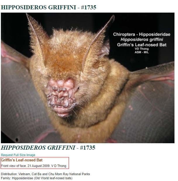 بالبحث عن اسم الخفاش في محرك البحث غوغل، تظهر لدينا العديد من النتائج وكان من ضمنها موقع mammalogy.org الذي نشر الصورة الكاملة لذات الادعاء وقال إنها لخفاش غريفين ذي الأنف الورقي وأرجع حقوق الصورة إلى VD Thong وهو (Vu Dinh Thong) عالم الثدييات في أكاديمية فيتنام للعلوم والتكنولوجيا.