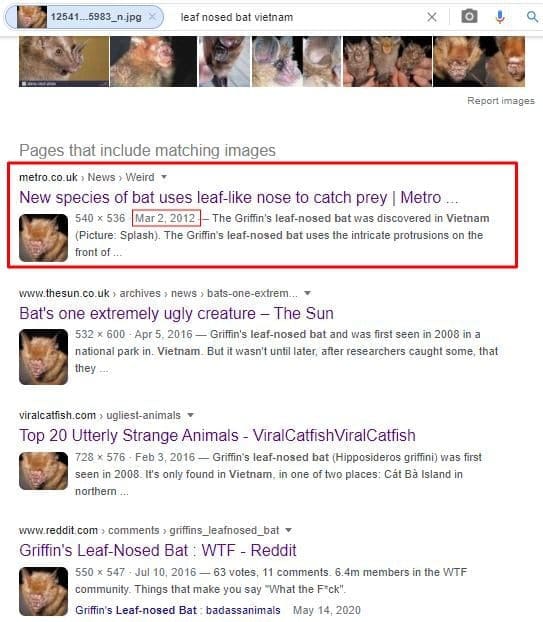 عند البحث عن صورة الكائن في محرك البحث غوغل باستخدام خاصية البحث العكسي عن الصور، تعرف محرك البحث على الصورة تحت عنوان Leaf nosed bat vietnam (خفاش ذو الأنف الورقي فيتنام)، وظهرت لدينا العديد من النتائج وكان من ضمنها موقع metro.co.uk