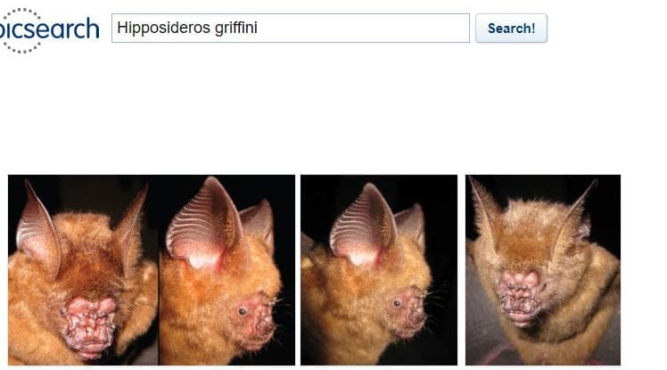 بالبحث أيضًا في موقع picsearch.com باستخدام الكلمة الدلالية (Hipposideros griffini) عثرنا على صورة الادعاء ذاتها منتشرة في موقع معهد هاريسون البريطاني.