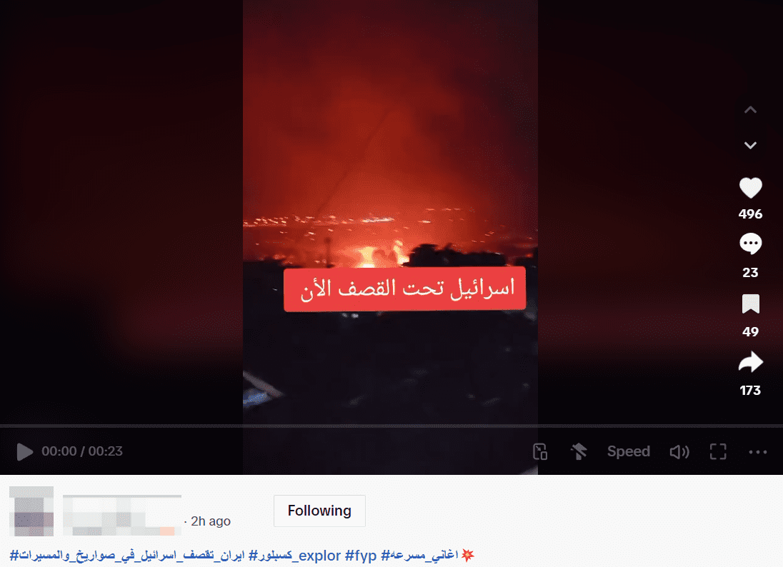 في أعقاب ذلك، تداول ناشطون على تيك توك مقطعاً يدّعون أنه يظهر آثار القصف الإيراني الذي استهدف تل أبيب،