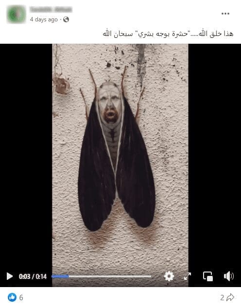 تناقل ناشطون على الفيسبوك مقطع فيديو يدّعي ناشروه أنه يظهر حشرة حقيقية غريبة تمتلك وجه إنسان.