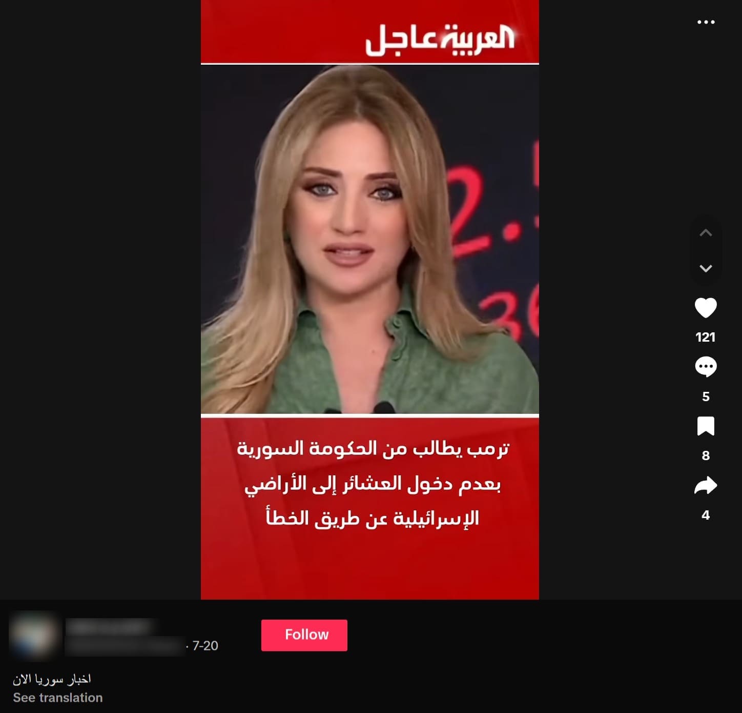 بحسب وكالة الأنباء رويترز –دون تصرف-: «اندلعت أعمال العنف في السويداء في 13 يوليو بين مقاتلين من العشائر وفصائل درزية. وأُرسلت قوات حكومية لاحتواء القتال، لكن سفك الدماء تفاقم، فيما نفذت إسرائيل ضربات ضد القوات السورية باسم الدروز»، في هذا السياق تداول ناشطون على منصات التواصل الاجتماعي مقطع فيديو يدّعون أنه يصوّر نشرة إخبارية لقناة العربية تفيد بمطالبة ترامب للحكومة السورية بعدم دخول العشائر إلى الأراضي الإسرائيلية.