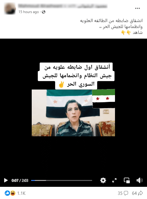 هذا المقطع متداول منذ عام 2012، ولا يبين انشقاق ضابط من الطائفة العلوية عن الجيش السوري حديثا
