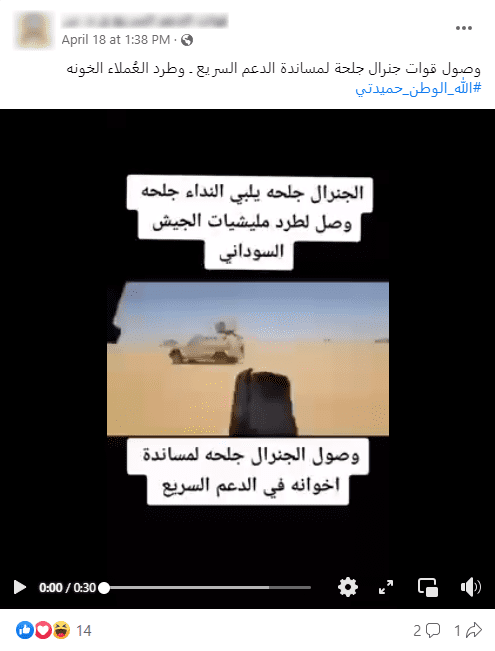 هذا المقطع متداول منذ عام 2019، ولا يبين وصول قوات الجنرال جلحة لمساندة قوات الدعم السريع