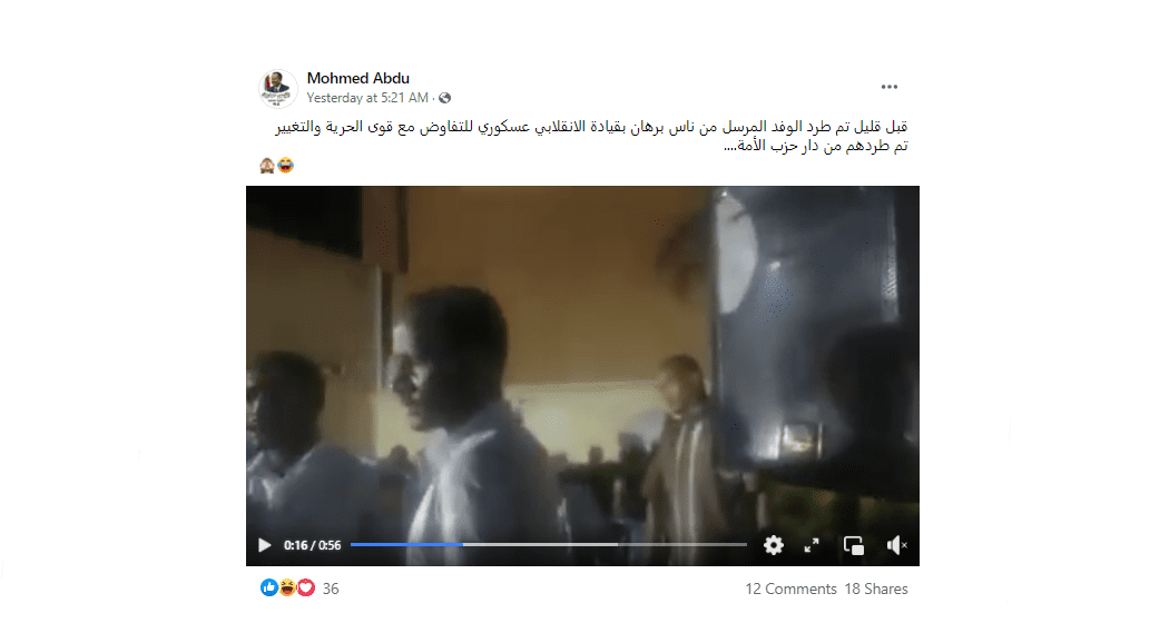 انتشر على مواقع التواصل الاجتماعي مقطع فيديو يزعم ناشروه أنه يظهر طرد الوفد المرسل من قبل برهان من دار حزب الأمة، فما حقيقة هذا المقطع؟