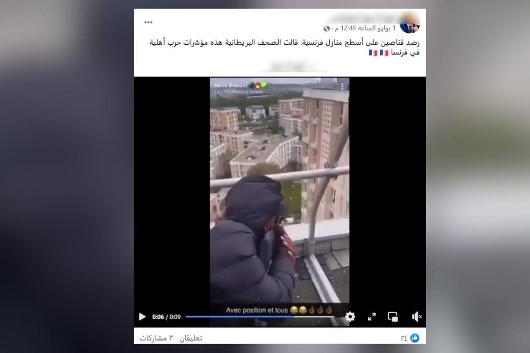 هذا المقطع متداول منذ مارس 2022 على الأقل، ولا يظهر رصد قناصٍ على أسطح المباني الفرنسية مؤخرًا
