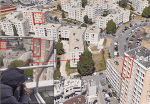 والتي يمكن مطابقة أحد أحياءها المتوفرة صورها على خرائط Google Earth مع المعالم الظاهرة في مقطع الادعاء،