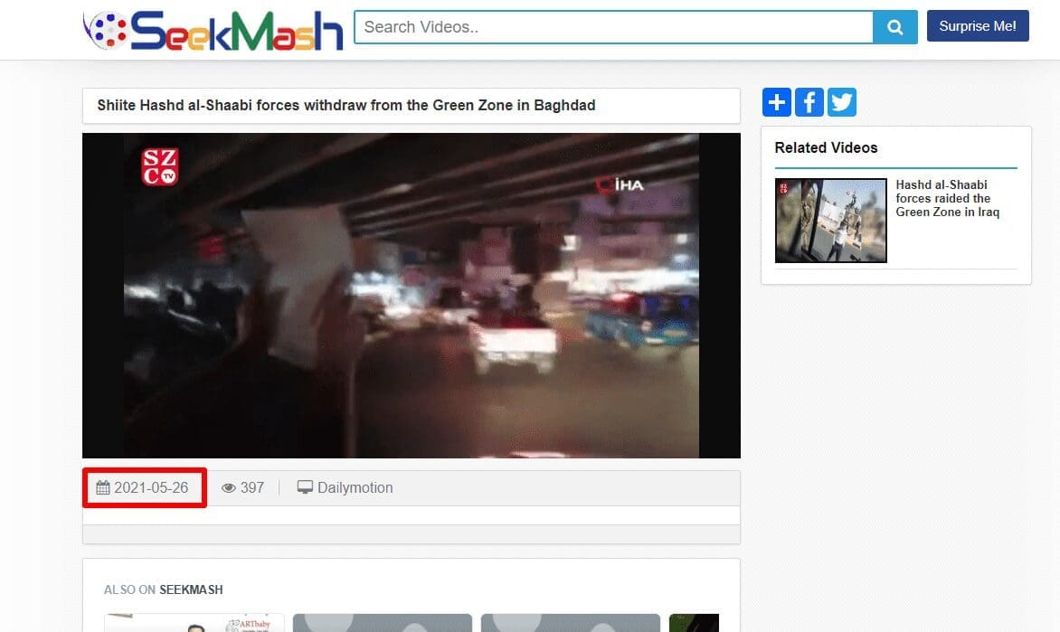حيث نشر الموقع مقطع الادعاء ذاته بتاريخ 26 مايو 2021 على أنه يظهر انسحاب قوات الحشد الشعبي من المنطقة الخضراء،