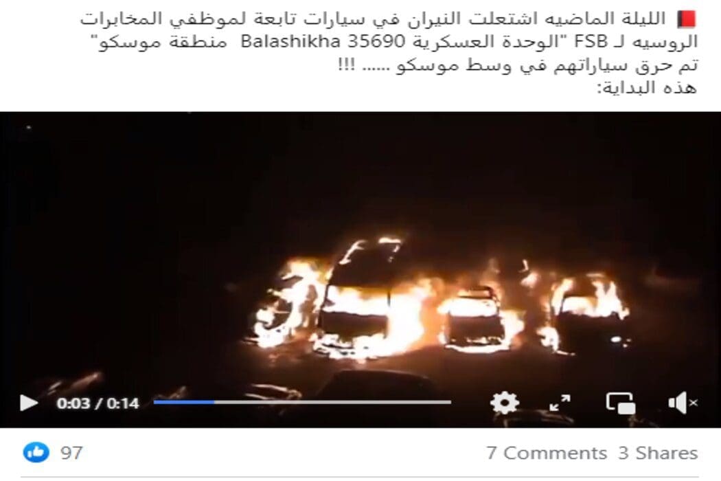 يتداول رواد موقع التواصل الاجتماعي فيسبوك مقطعًا يزعمون أنه يظهر احراق سياراتٍ تابعةٍ لموظفي الاستخبارات الروسية في موسكو مؤخرًا،