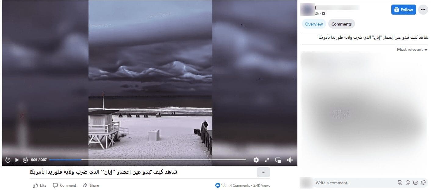إثر ذلك يتداول ناشطون على مواقع التواصل الاجتماعي مقطعًا يزعمون أنه يظهر لحظة دخول الإعصار “إيان” إلى شواطئ ولاية فلوريدا،