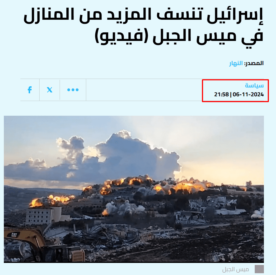 إذ قاد البحث العكسي عن إحدى لقطات المقطع على Google Lens إلى موقع صحيفة النهار اللبنانية، والتي كانت قد شاركت مقطع الادعاء ذاته مرفقاً بالعنوان الآتي، -بدون تصرف-: “إسرائيل تنسف المزيد من المنازل في ميس الجبل (فيديو)”، وذلك بتاريخ 6 نوفمبر 2024، أي قبل بدء سريان الهدنة في 27 نوفمبر 2024.