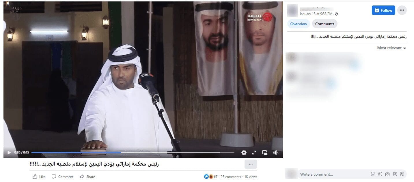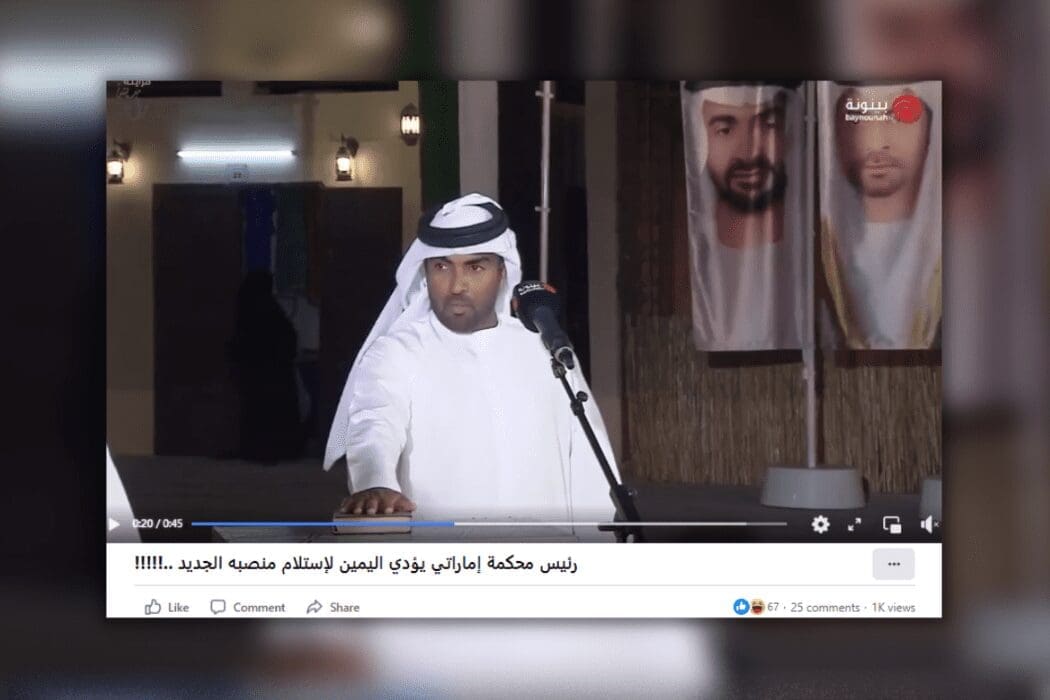 انتشر على مواقع التواصل الاجتماعي مقطع فيديو يزعم ناشروه أنه يظهر قاضي ورئيس محكمة إماراتي خلال أداء اليمين لاستلام منصبه.